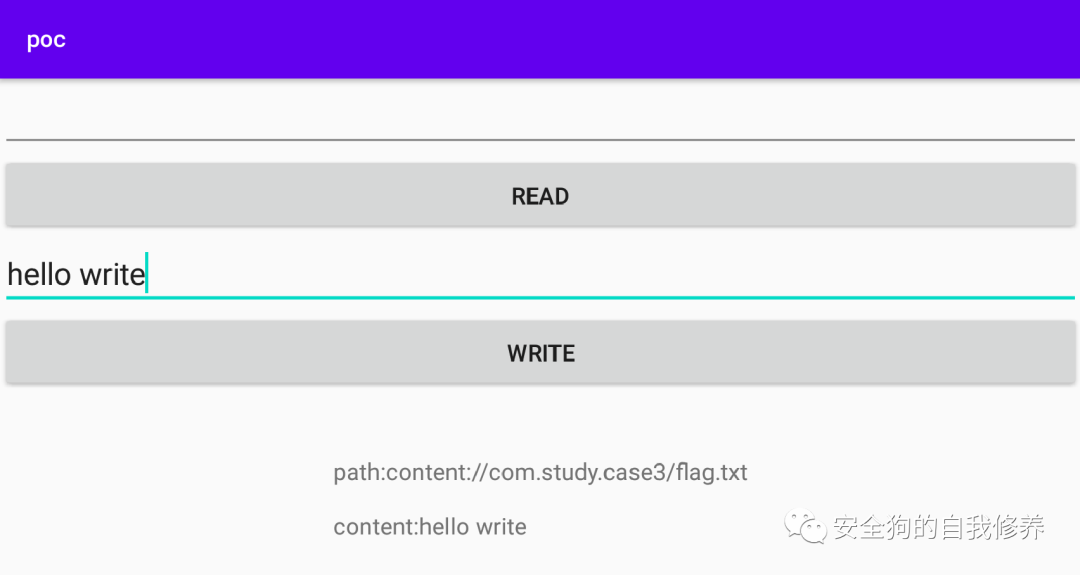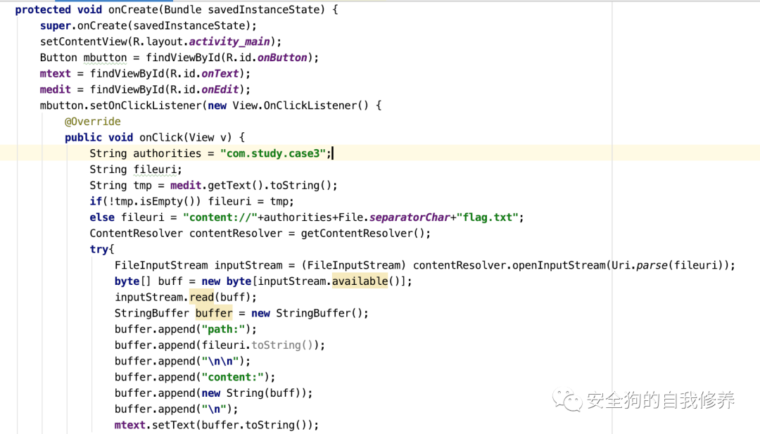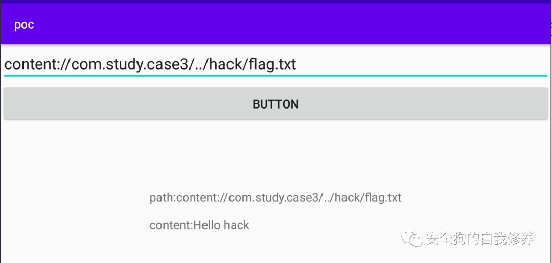 // 利用../路径穿越到hack目录下,读取flag.txt文件String uri = "content://com.study.case3/../hack/flag.txt"