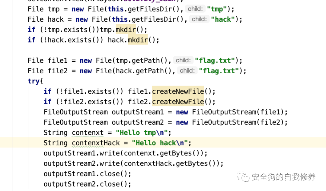 为了学习这个openFile接口,我编写了一个case3应用。功能很简单,应用启动时在/data/data/pagename/files 目录下创建tmp、hack两个目录,在tmp、hack两个目录下分别创建了flag.txt文件,tmp目录下的flag.txt文件内容是 “hello tmp”,hack目录下的flag.txt文件内容为“hello hack”。
