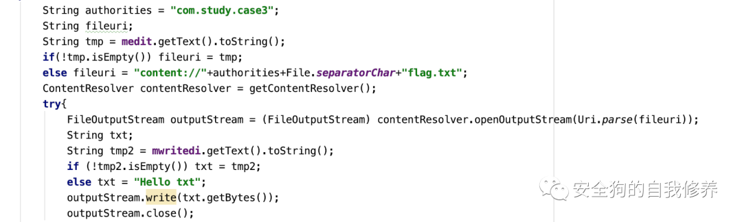 String uri = "content://com.study.case3/flag.txt"; //这是读取tmp目录下的flag.txt文件