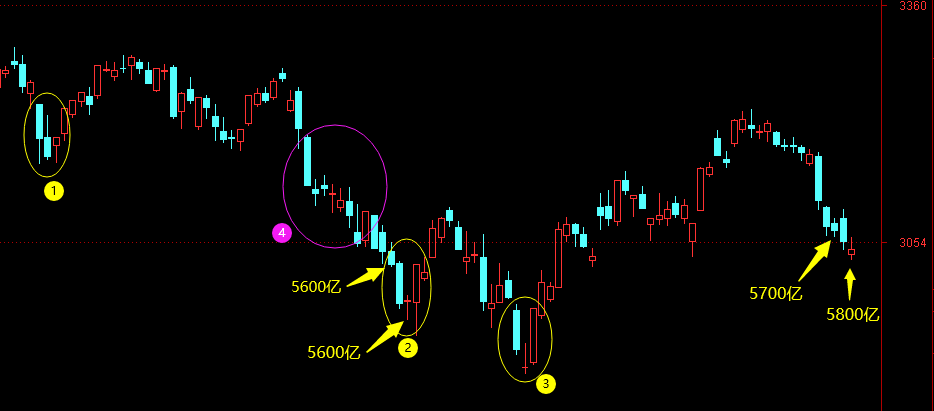 我觉得有点像2的位置,很像。但如果下周初指数迟迟不给力,又磨磨唧唧跌回去了,那我会觉得像4。又要阴跌了。