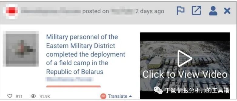 社交媒体内容显示,2022年2月初白俄罗斯的军事活动有所增加,可见东欧局势升级的规模。