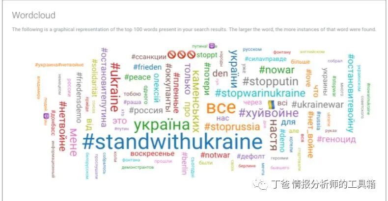 一个词云代表VK和OK.ru(俄罗斯流行网络)的内容,使用标签#standwithukraine。OSINT工具对于生成分析以评估俄罗斯对战争的公众情绪是有价值的。