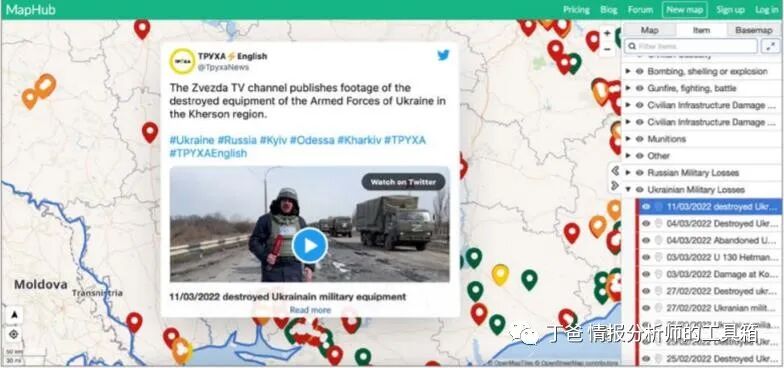 OSINT的调查已经产生了像上面的俄罗斯-乌克兰监测地图这样的工具,这是一项追踪和核实军事活动的众包工作。