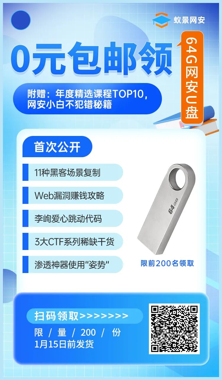 我们将把蚁景网安2022年度Top10课程的全套视频课件,连同这枚64GB的大容量U盘,作为新年礼物赠送给想要收获真正的网安实战技术的朋友们!祝大家新年快乐!梦想成真!![]()