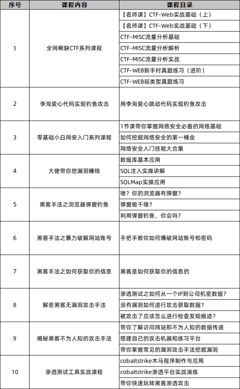 全面涵盖:0基础小白入门系列、大佬带你挖漏洞赚钱系列、最火李峋爱心代码之钓鱼攻击、最具人气CTF系列、渗透工具实战系列,以及黑客最常用攻击手法系列等热门课程。![]()