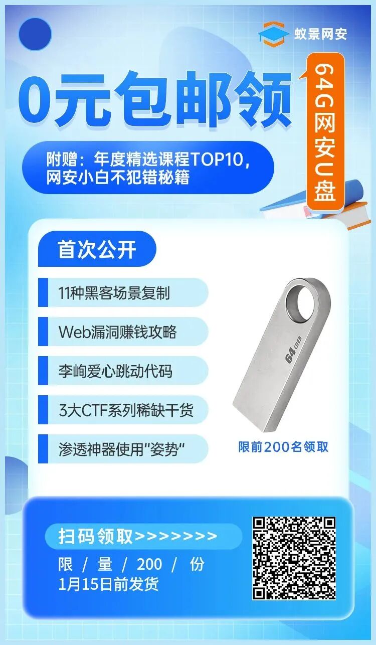 我们将把蚁景网安2022年度Top10课程的全套视频课件,连同这枚64GB的大容量U盘,作为新年礼物赠送给想要收获真正的网安实战技术的朋友们!祝大家新年快乐!梦想成真!![]()