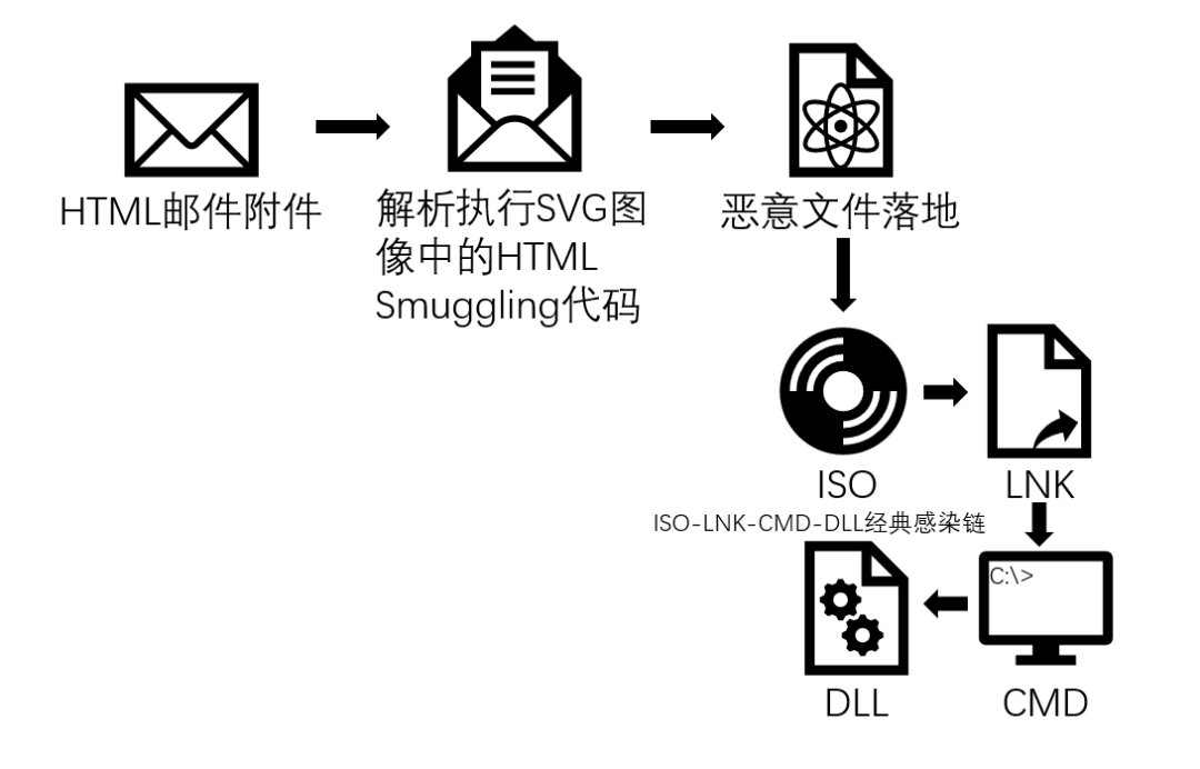 攻击者以钓鱼HTML邮件附件作为入口,执行隐藏在SVG图像中的HTML Smuggling代码以落地恶意载荷。最后通过诱使受害者执行ISO的快捷方式实现恶意DLL的加载。