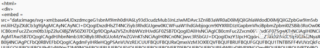 攻击者利用SVG图像中可以嵌入脚本的特点,将HTML Smuggling的JS代码用<script>标签嵌入到SVG图像中,然后将SVG文件以Base64编码的形式,利用embed或iframe标签由浏览器在渲染时执行: