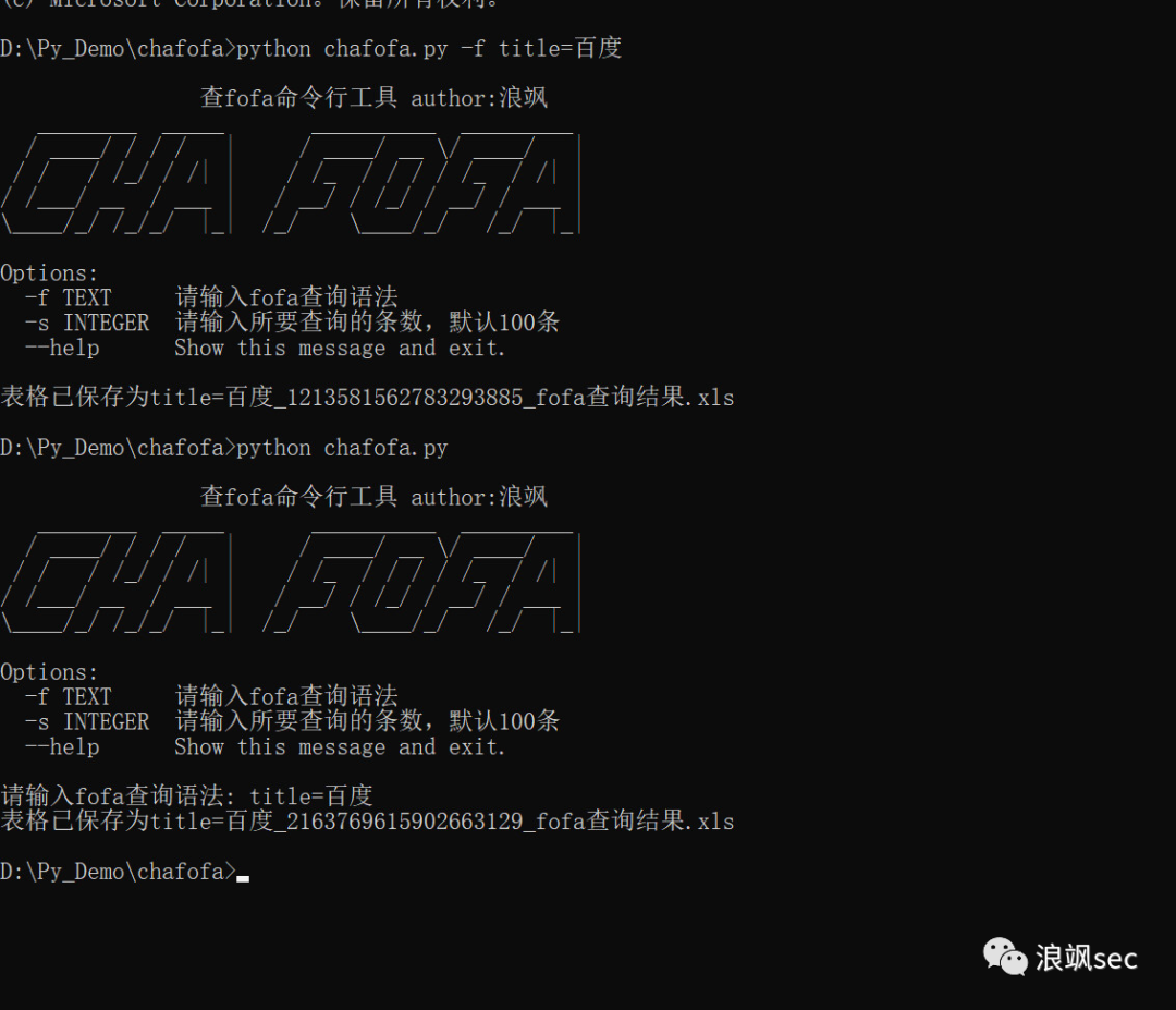 查fofa命令行工具 author:浪飒 Options: -f TEXT 请输入fofa查询语法 -s INTEGER 请输入所要查询的条数,默认100条 --help Show this message and exit
