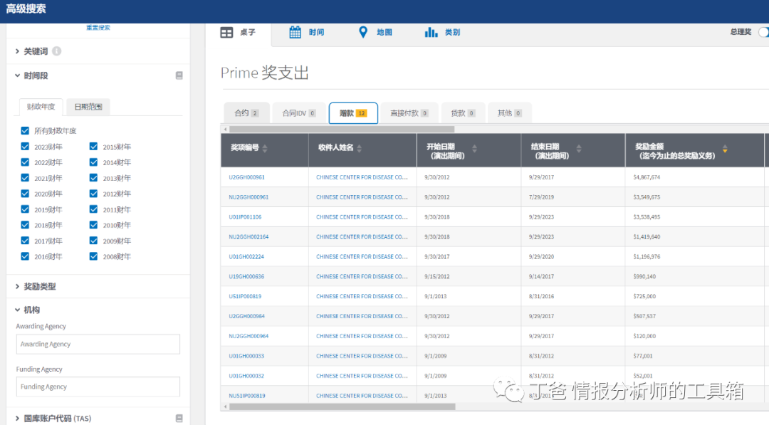 | 990140 | 2012/9/15 | 2017/9/14 | 卫生与公众服务部 (HHS) | 美国疾病控制和预防中心 | 中国疾病预防控制中心 | 93.283:疾病控制和预防调查和技术援助中心;93.283:《平价保健法》:疾病控制和预防中心——投资 | 在中国开展公共卫生研究 | https://www.usaspending.gov/award/ASST_NON_U19GH000636_7523/ |