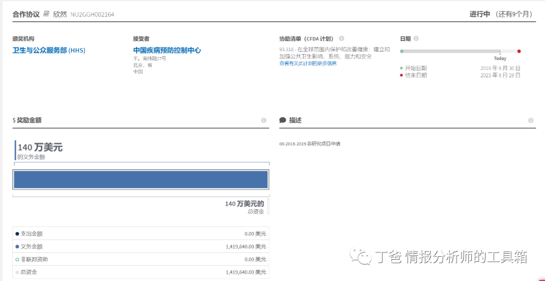 | 120000 | 2012/9/30 | 2017/9/29 | 卫生与公众服务部 (HHS) | 美国疾病控制和预防中心 | 中国疾病预防控制中心 | 93.283:《平价保健法》:疾病控制和预防中心——投资 | 中国疾病控制与预防中心 | https://www.usaspending.gov/award/ASST_NON_NU2GGH000964_7523/ |