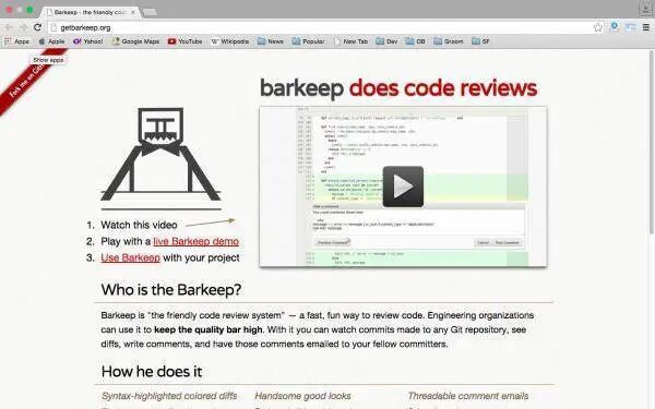 Barkeep是“非常友好的代码审查系统”——让你用一种快速又有趣的方式来检查代码。你也可以用它翻阅Git存储库的提交,看diff文件,写注释,并且你还可以将这些注释通过电子邮件发送给下一位提交者。