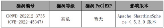 近日,嘉诚安全监测到CNNVD官方发布了Apache ShardingSphere 身份认证绕过漏洞的安全风险通告,漏洞编号为:CNNVD-202212-3735(CVE-2022-45347)。