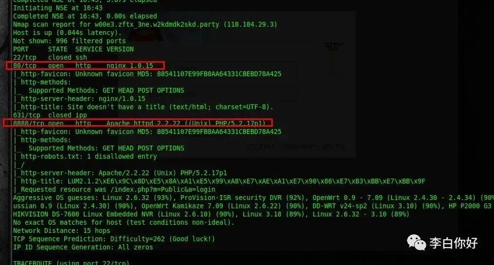 先用Nmap扫一下收集一下信息,发现是linux的系统,80端口和8888开放的,80端口是用Nginx ,8888端口用的Apache