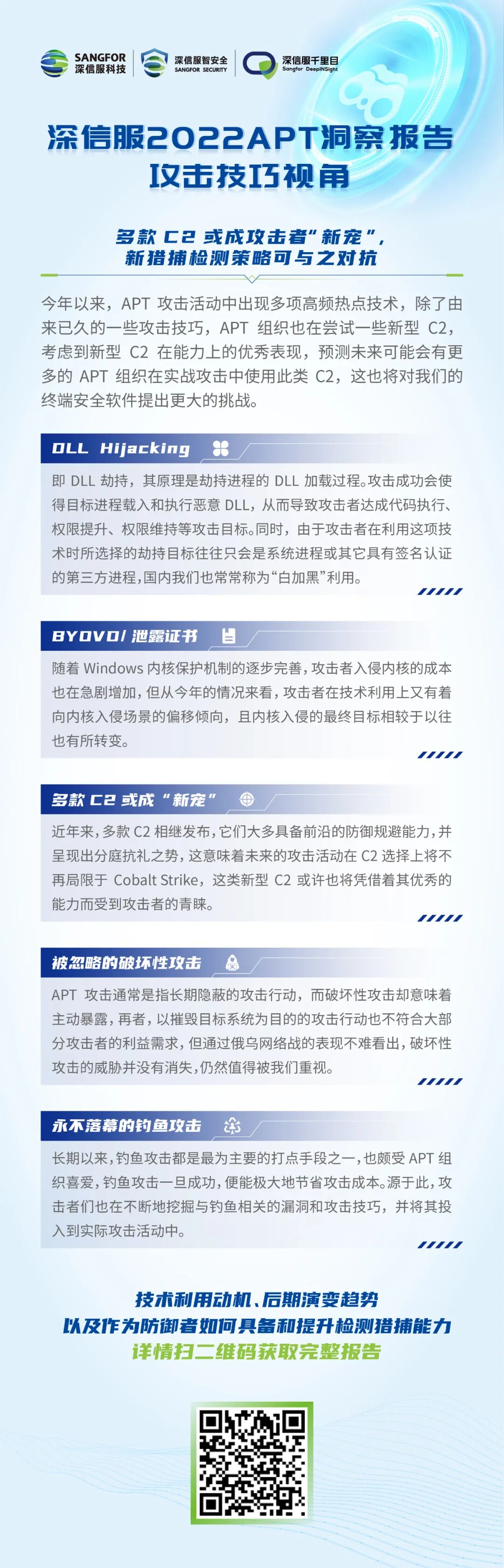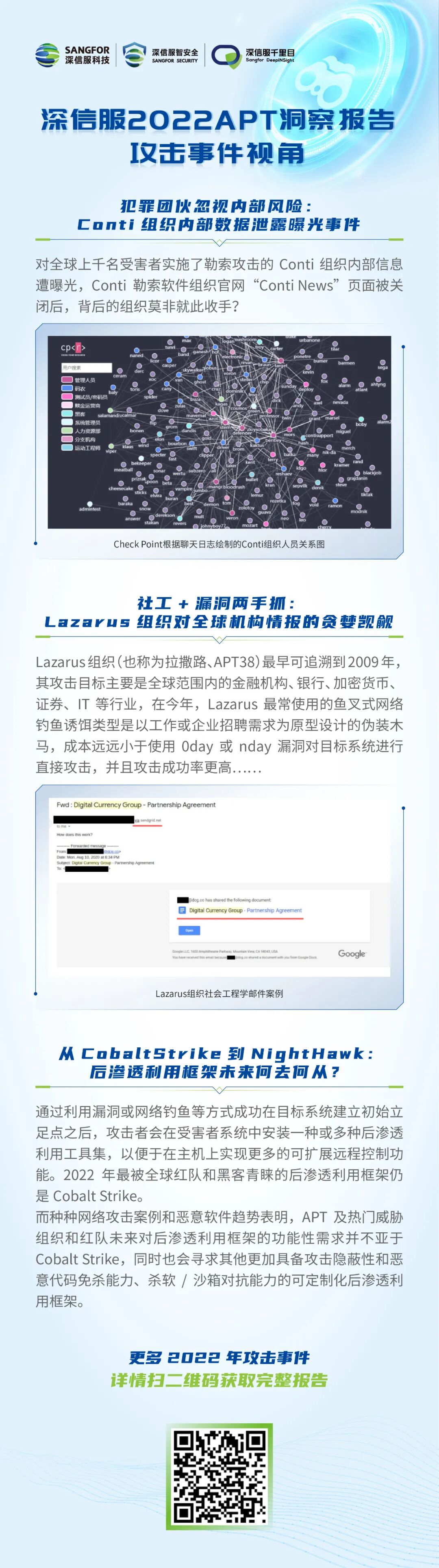 2022年,受多种因素影响,网络黑产和APT攻击大行其道,技术界限也正日渐模糊。APT组织在攻击技巧方面的创新性受到红队安全研究社区的影响痕迹明显,同时非常擅长将最新技术、最新工具应用在其攻击行动上。
