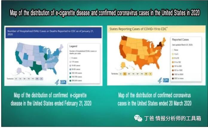 值得注意的是,随着我们进入2020年,电子烟或Vaping产品使用相关的肺损伤(EVALI)病例开始稳步下降,疾病控制与预防中心(CDC)网站上的数据于2月25日更新,相关主题页面于3月24日被删除。也就是说,自从冠状病毒动脉疾病出现以来,数百个先前在美国确认的E-卷烟或Vaping产品使用相关肺损伤(EVALI)病例突然消失,而没有从各个美国得到解释。部门。比较2020年2月和3月两种疾病的病例分布,你可以清楚地看到图中疾病高流行区域的颜色块重叠。