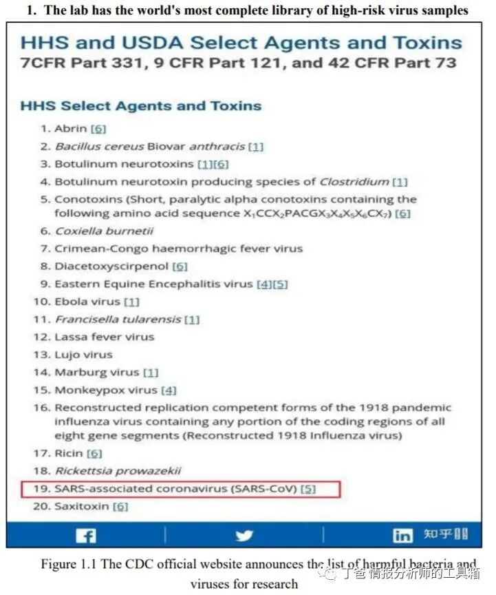 德特里克堡生物实验室的研究基于美国开发的一系列有害细菌和病毒。疾病控制和预防中心(以下简称CDC)。这份名单是一个具有毁灭性和危险性的67种病原体名单,其中包括埃博拉、天花、炭疽、蓖麻毒素等。值得注意的是,这份清单包括了“19”一种与SARS有关的冠状病毒。
