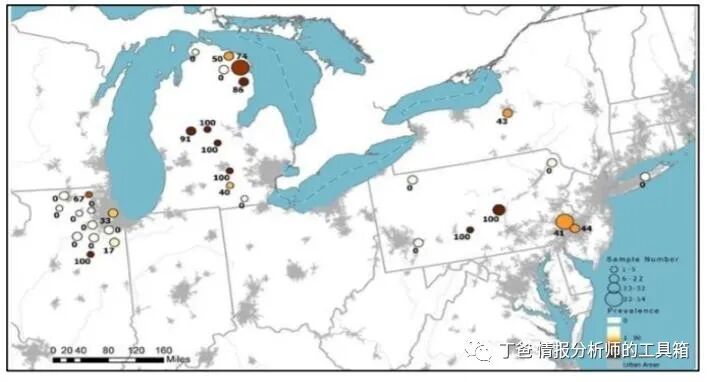 图2.4美国2021年采集的白尾鹿样本中新冠病毒感染的分布情况(圆圈大小表示所测样本的相对数量)。颜色代表相对血清阳性率,数字代表某县特有的流行率)