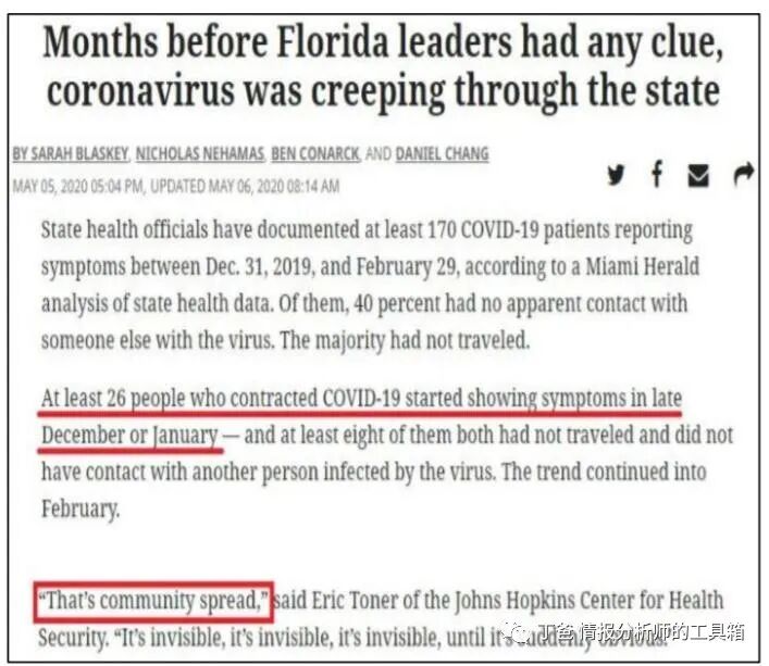 2020年1月,在美国佛罗里达州出现了171名有新冠肺炎症状的患者,他们都没有到中国旅行的经历,比该州首例官方报道的新冠肺炎确诊病例提前数月。然而,关键数据随后被从佛罗里达州卫生部网站上删除。