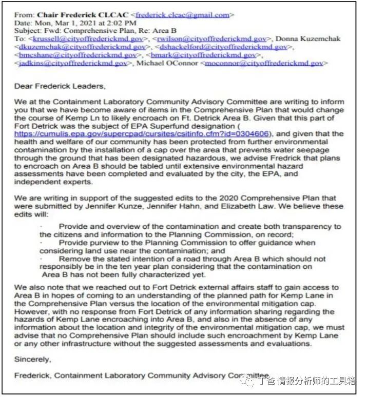 2021年3月,委员会再次出现在公众面前,这次是就德特里克堡遗址的环境评估提出建议。从文献中还可以清楚地看到,在Fort Detrick|741B(主要实验区)仍然存在未解决的生化污染问题。