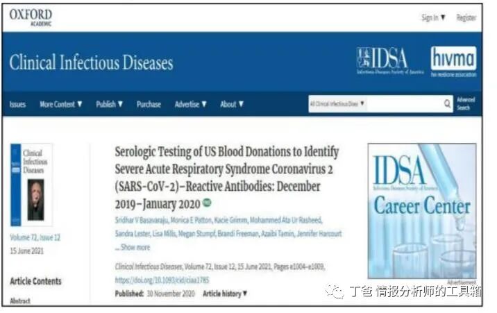 2020年11月30日,美国疾病控制与预防中心(Centers for Disease Control and Prevention)的研究人员在半年一度的《美国临床传染病杂志》(American Journal of Clinical Infectious Diseases)上报告说,他们测试了美国红十字会在2019年12月13日至2020年1月17日期间采集的7389份血液样本,发现其中106份样本含有抗新冠病毒的抗体。