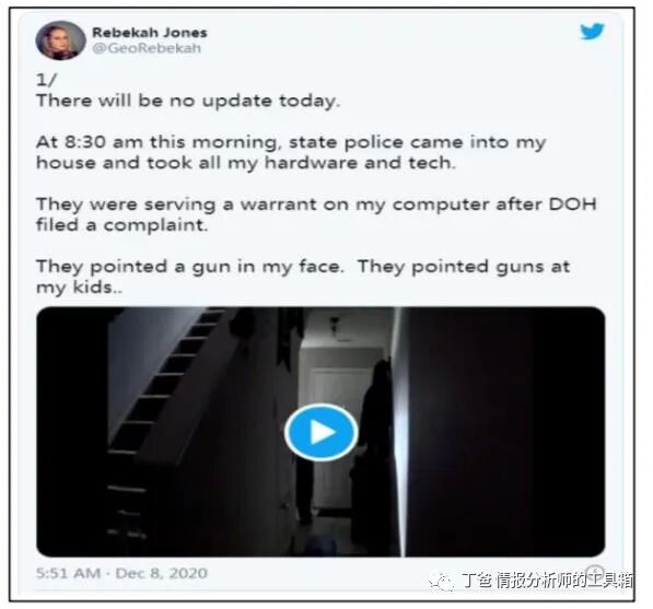 丽贝卡·琼斯(RebekahJones)是佛罗里达州卫生部(FloridaDepartmentofHealth)前高级数据主任,负责创建佛罗里达疫情信息发布系统。她在2020年底突然被解雇。琼斯后来在一次采访中表示,上级指示她删除了数据库数据,她对此提出质疑并拒绝服从[68]。2020年12月,佛罗里达执法官员在枪口下突袭并搜查了琼斯的家,指控他入侵佛罗里达州卫生部的通信系统,并没收了她的电脑、手机和其他许多电子设备。全国的舆论都感到震惊。