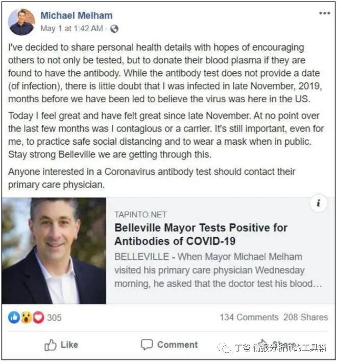 2020年4月30日,新泽西州贝尔维尤市市长迈克尔·梅勒姆(Michael Melham)表示,早在2019年11月,他就感染了新冠肺炎,但医生诊断他患上了流感,但后来冠状病毒抗体检测证实,他感染了新冠肺炎。