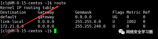 每个路由器内部会维护一个路由表,我们可以通过route命令查看云服务器上对应的路由表。