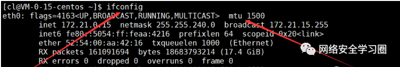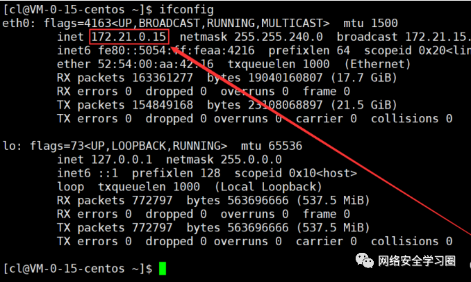 我们可以通过ifconfig命令来查看我们这台机器的私网 IP,其中网络接口 lo(loop)代表的是本地环回,而 eth0 代表的就是我这台机器的网络接口,可以看到我的私网 IP 地址是 172.21.0.15。