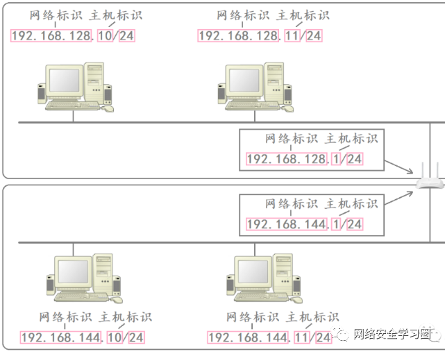 例如,下图中路由器连接了两个网段。对于网络标识来讲,同一网段内主机的网络标识是相同的,不同网段内主机的网络标识是不同的。而对于主机标识来讲,同一网段内主机的主机标识是不同的,不同网段内主机的主机标识是可以相同的。