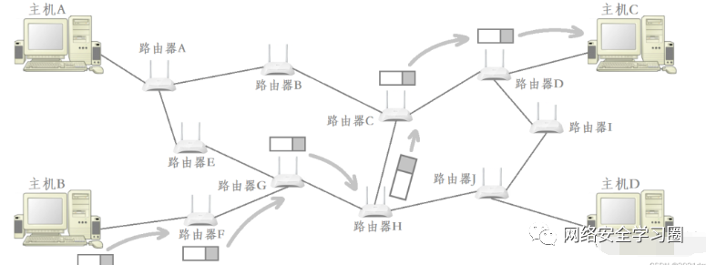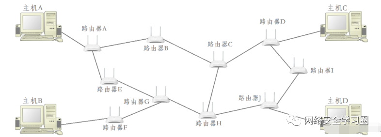 比如要将数据从主机 B 跨网络传送到主机 C,那么主机 B 需要先将数据交给路由器 F,路由器 F 再将数据交给路由器 G,…,最终由路由器 D 将数据交给主机 C。