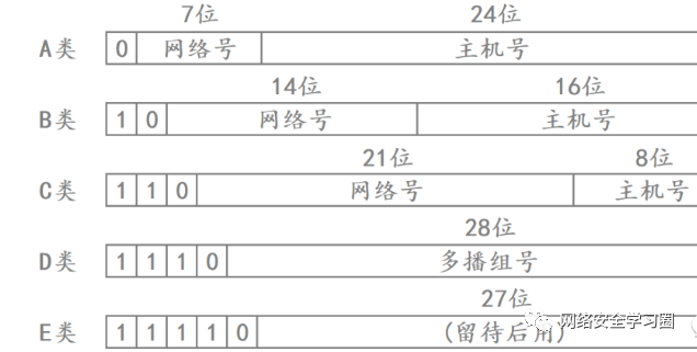 过去曾经提出一种划分网络号和主机号的方案,就是把所有 IP 地址分为五类,如下图所示: