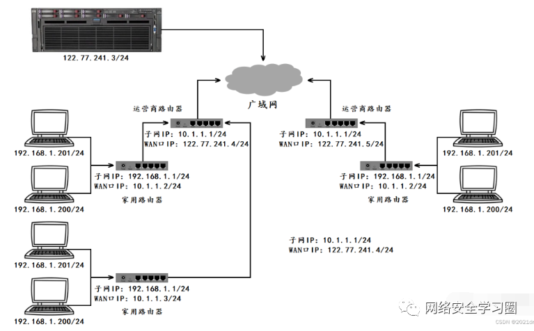 我们使用的电脑、家用路由器、运营商路由器、广域网以及我们要访问的服务器之间的关系大致如下: