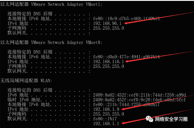 此外,打开 Windows 当中的 cmd 窗口,通过ipconfig命令可以看到大量以 192.168 开头的私网 IP。