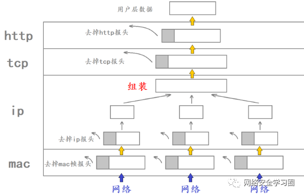当 MAC 帧从网络中获取到数据后,MAC 帧也不关心这个数据是否需要进行组装,MAC 帧只需要将该数据的 MAC 帧报头去掉后直接上交给上层 IP 就行了,而至于该数据的组装问题则是 IP 需要解决的。