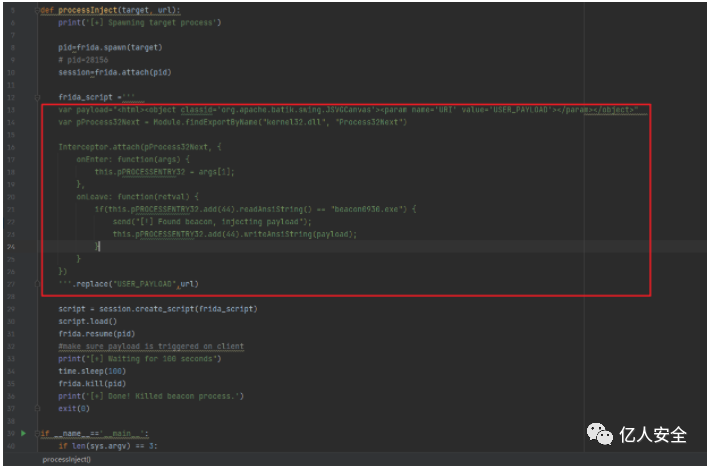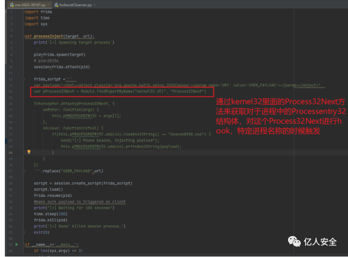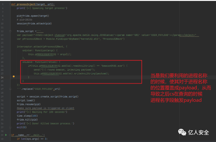 上图,给我看懵了笔者没用过这个frida的脚本,也不会写,这么秀的吗,这么简单的嘛,因为之前笔者拿c++去实现过伪装进程的程序,于是就先入为主,认为Process32Next获取的ProcessENTRY32结构体好像根本改不了,要从peb那边去找Processparameters,然后找imagepathname和commandline做修改,而且效果不好,在win10和win11上没有实现篡改这个进程名,可以实现对commandline的修改,而且修改peb里面的相关参数的时候,还有长度限制,超过原来长度,自动被截断了反正没达到想要的效果。最后回头一看发现自己对hook这个概念还是没有理解透彻,其实这里并没有真正的修改进程的名称,而是在kernel32.dll的导出函数Process32Next里面做了个挂钩,当有调用这个函数的地方的时候(查询进程相关信息的时候会调用这个方法,也就是cs的processlist里面的进程名的由来),这个挂钩会去检测返回的Processentry32里面的ImageFileName字段是否是beacon.exe,是的话就会替换成我们的payload,学废了学废了,如下图中标注的: