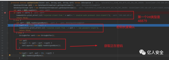 4、server端会在authenticate方法里面将socket的client端也就是我们使用的aggressor端发送来的数据进行处理: