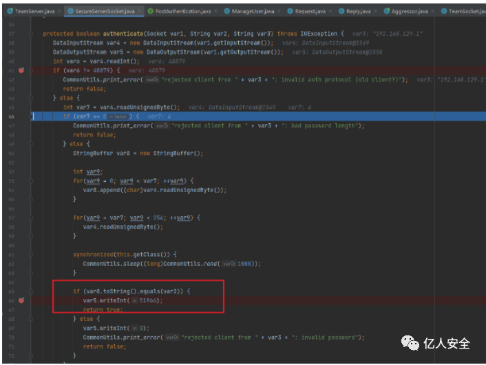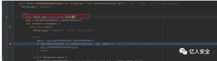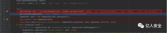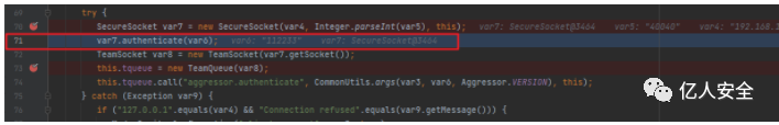 如下图,aggressor端调用了SecureSocket的authenticate方法,并传入参数,这个参数就是我们输入的密码: