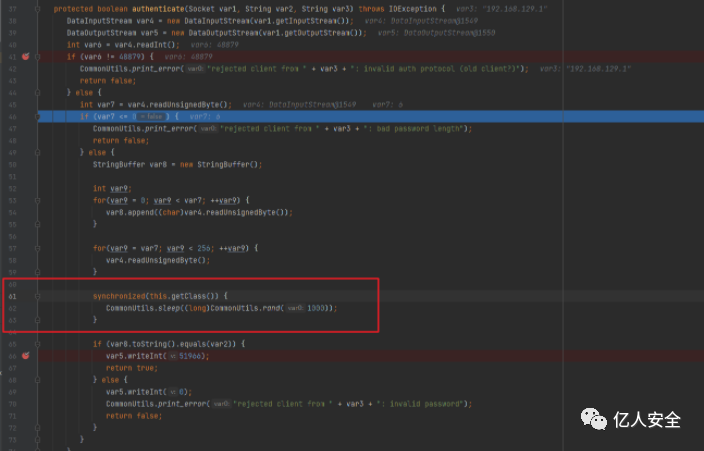 如下图,红框中的代码就是cs对爆破的防御手段,上了一个同步锁,调用sleep函数,睡眠0-1秒。所以我们爆破只能迁就其最大值,1秒钟只能爆一个值,所以爆破这个方法就比较鸡肋了(一个10万的字典在不考虑网络延迟的情况下都得跑一两天,这期间还容易被server的控制者发现,所以就很难了)