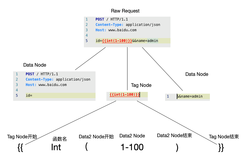 然后将 Tag 节点替换为执行结果(如果一个 Tag 生成了多个结果就做笛卡尔乘积,生成多份数据),再将数据按顺序拼接起来,就是最终的执行结果。知道了原理后,再想下为什么函数要与{{}}成对使用?原因是为了区别 Data 节点和 Tag 节点,遇到{{开始解析 Tag 节点,遇到}}结束解析,{{}}外面都是数据节点。再看下 Tag 节点内,包含函数名和参数,这里参数也是 Data 节点,这里节点开始的标志是遇到(,结束的标志是遇到),一个请求包解析的语法树如图: