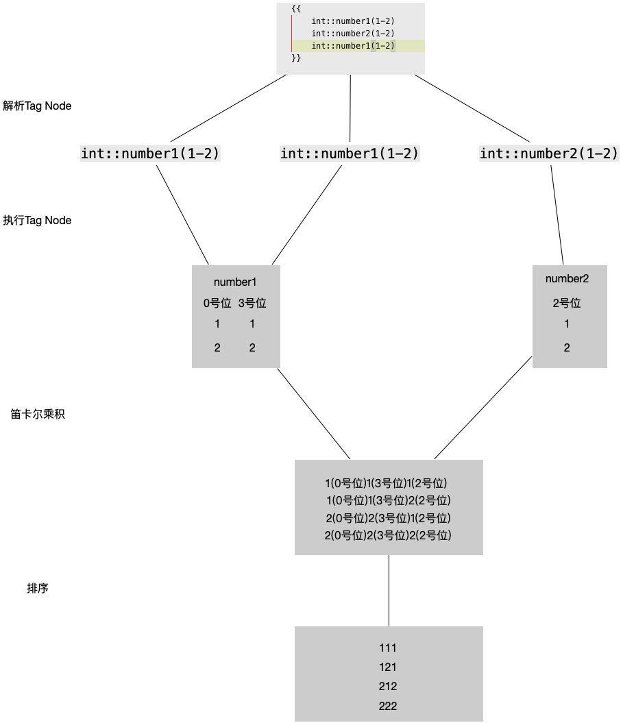 原理上就是在每个函数后加一个 Label ,在生成数据时,会将具有相同 Label 的数据记录当前位置并打包,再将他们进行笛卡尔乘积,再将打包的数据恢复到原位置,原理类似下面这个过程,但实际在笛卡尔乘积过程中就已经进行了排序。
