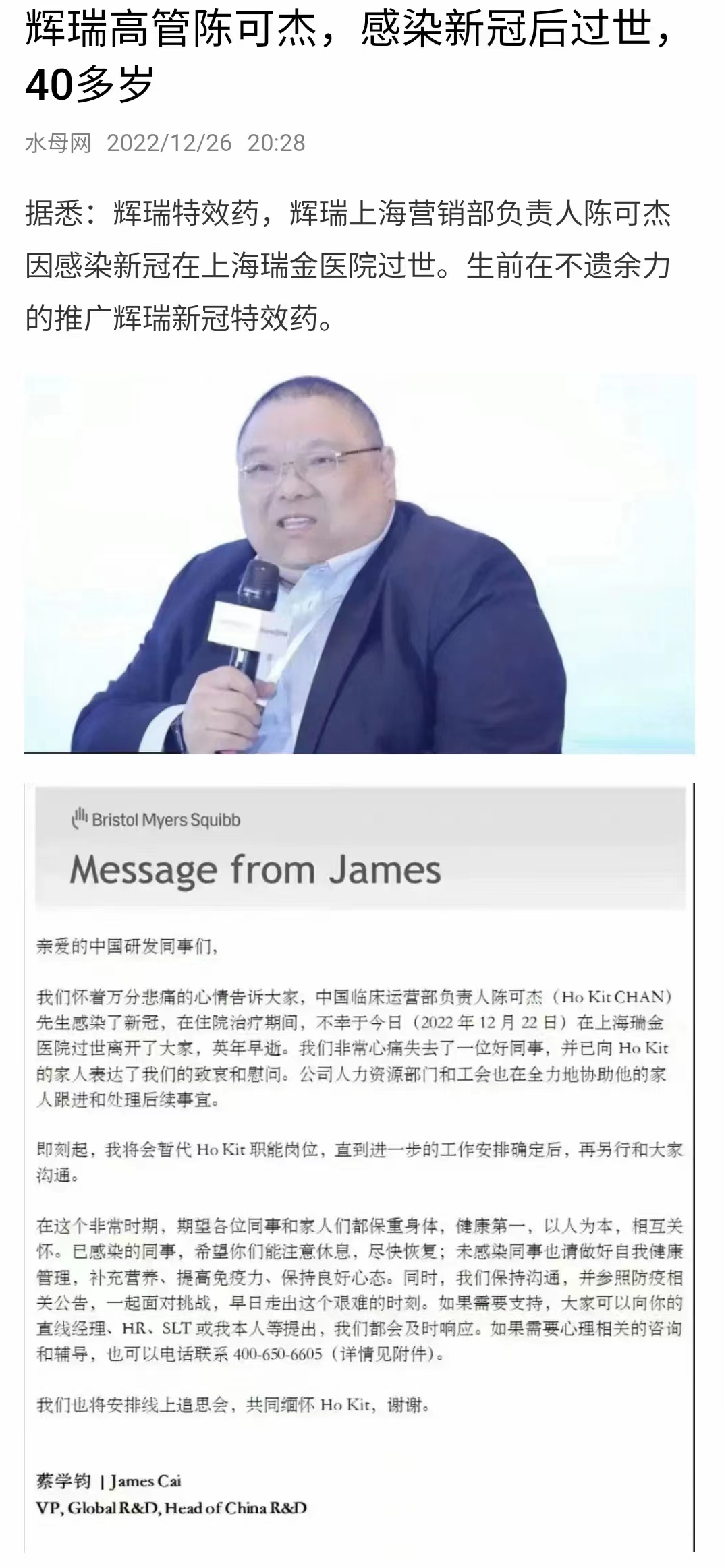 比如前几天有个谣言,说“生前不遗余力推广辉瑞新冠特效药”的“辉瑞上海营销部负责人陈可杰”感染新冠死了,你们可以点开图片放大看一下: