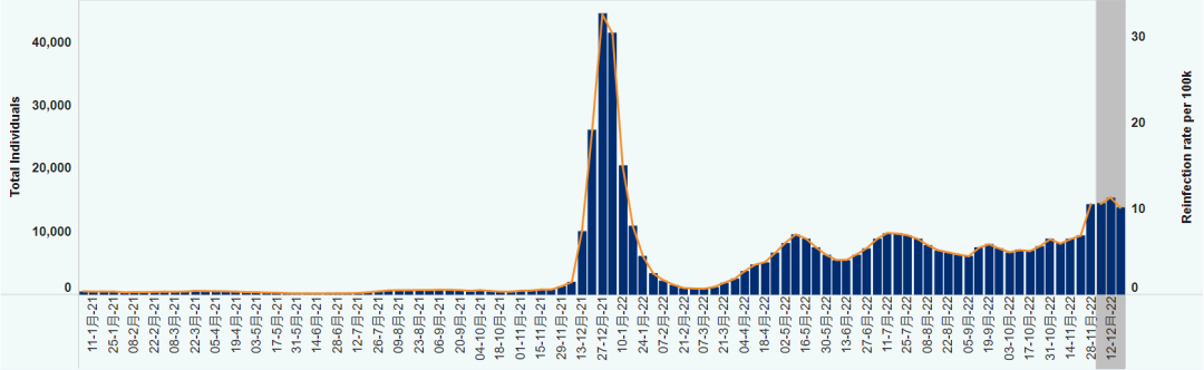 因为 Omicron 对之前的毒株感染后形成的免疫屏障有较强的逃逸。这也是为什么针对原始毒株制造的疫苗对 Omicron 的防感染能力很差。所以最大一波再次感染其实早就发生了,就发生在 2021-2022 那个冬天 Omicron 刚兴起的时候。这一点在下面美国纽约州的再次感染数据趋势图上可以看得很清楚。