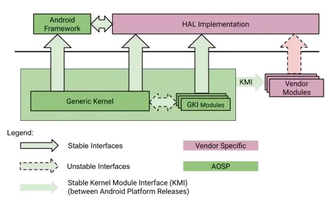 Android kernel基于上游 Linux LTS (Linux Long Term Supported,长期支持) 内核。在 Google,LTS 内核会与 Android 专用补丁结合,形成所谓的“Android 通用内核 (ACK,Android Common Kernel)”。较新的 ACK(版本 5.4 及更高版本)也称为 GKI (Generic Kernel Image,通用内核镜像 )内核。GKI项目通过统一核心内核并将 SoC 和板级支持从核心内核移至可加载模块中,解决了内核碎片化问题。GKI 内核为内核模块提供了稳定的内核模块接口 (KMI),因此模块和内核可以独立进行更新。GKI 具有以下特点: