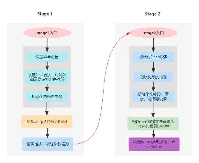 一般也可将Bootloader程序的执行分为两个阶段,如下图所示