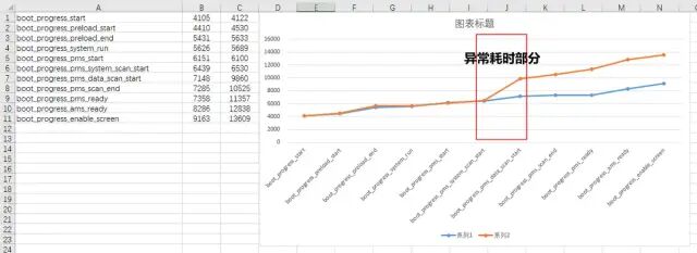 可以将测试机与对比机抓取的此log数据制作成表格,制作成折线图,可以更加直观的观察到耗时异常的流程。
