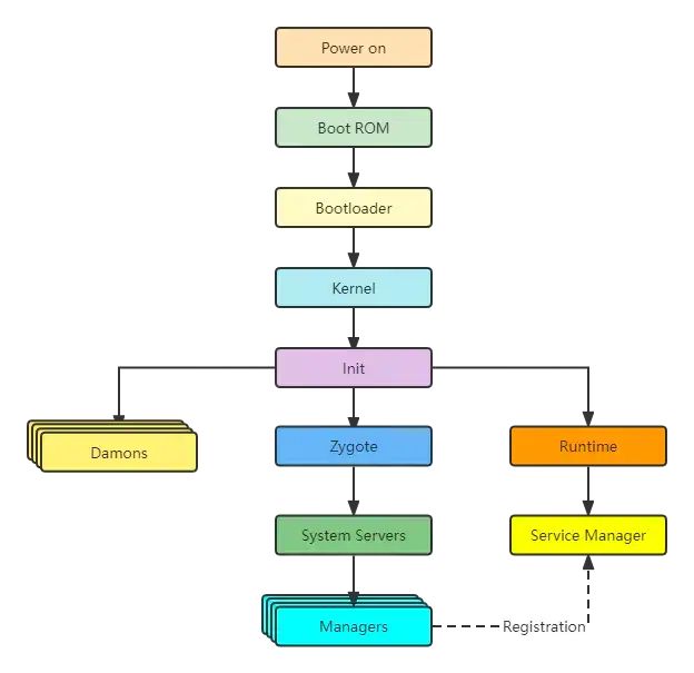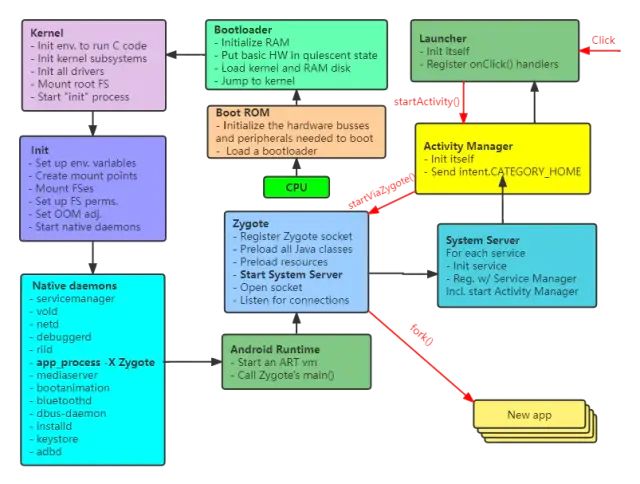 要想进行开机速度的优化,首先需要了解开机的详细流程。开机过程从CPU上电开始,到锁屏界面显示出来结束。下图为比较简洁的开机流程图。