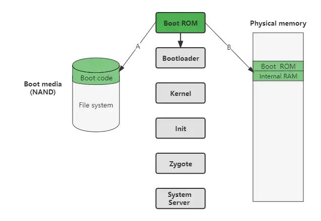 Boot ROM是硬编码在CPU内部固定地址的一段ROM(在一些较老的系统上也可能使用外挂Boot ROM(相对CPU来说)),这块代码是由CPU制造商提供。当用户按下电源键或者系统重启之后,触发CPU上电动作,此时其它硬件还未初始化,然而这块ROM就已经可读了。CPU首先执行PBL(Primary Boot Loader,主引导加载程序,固化在ROM上)代码。在必要的硬件初始化之后,Boot ROM开始加载Bootloader到RAM中,然后PC指针跳过去执行bootloader。在加载 Bootloader之前,PBL也可以进行验证。如果验证无法通过,则不会加载运行Bootloader,从而开机失败。